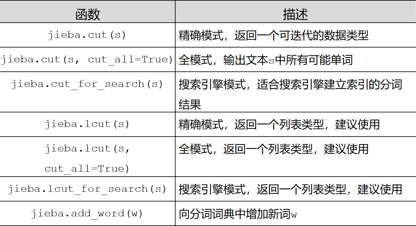 jieba是优秀的中文分词第三方库,需要额外安装,安装方式为pip install jieba,jieba库提供三种分词模式,最简单只需掌握一个函数