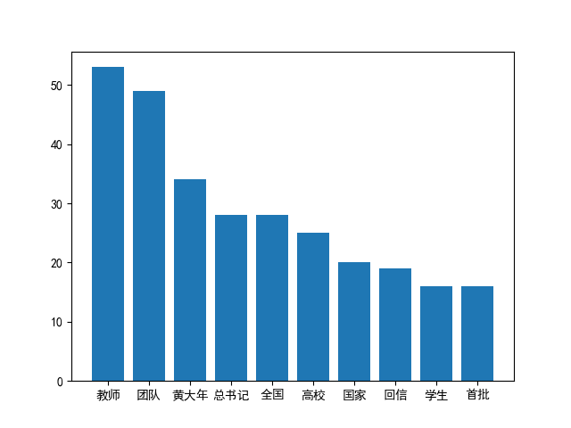 使用“222.txt”中出现频率最高的前 10 个词语,制作条形图,X 轴对应 10 个词语,y 轴对应每个词语的频率值,保存成“条形图 2.png”。