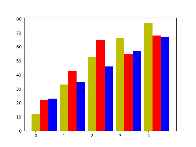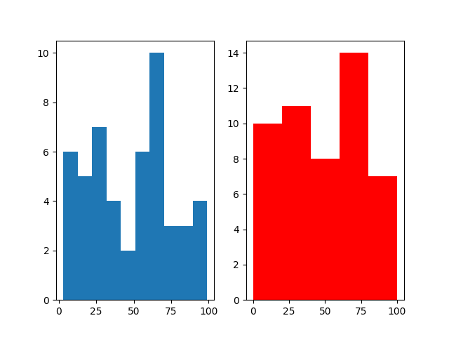 axes2.hist(x,bins=5,range=[0,100],histtype='barstacked',color='r')