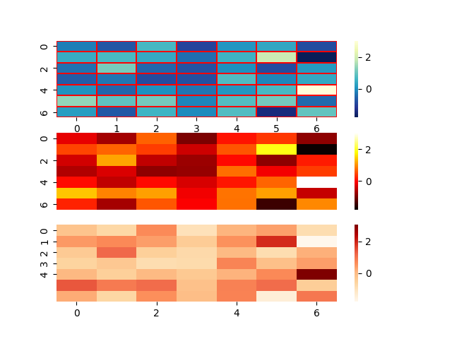 seaborn.heatmap(data, vmin=None, vmax=None,cmap=None, center=None, robust=False, annot=None, fmt=’.2g’, annot_kws=None,linewidths=0, linecolor=’white’, cbar=True, cbar_kws=None, cbar_ax=None,square=False, xticklabels=’auto’, yticklabels=’auto’, mask=None,…)
