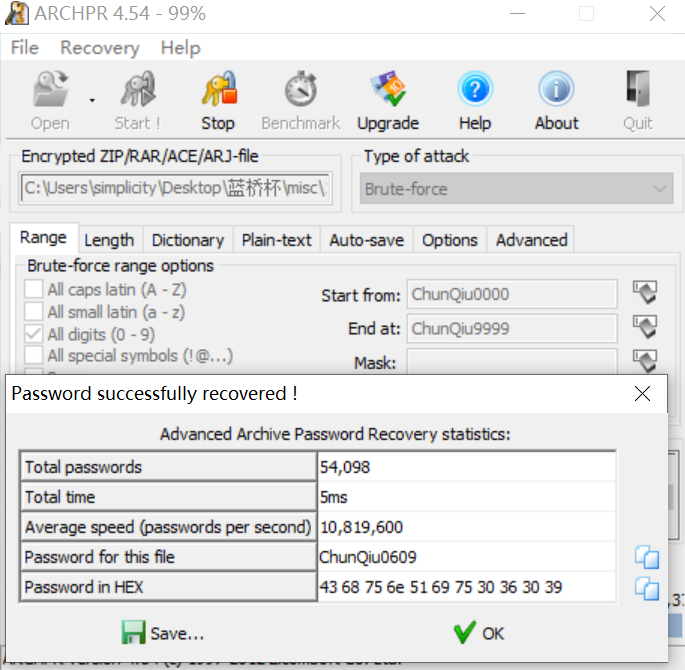 发现需要解压密码,压缩包备注里告诉了密码的格式。使用ARCHPR破解: